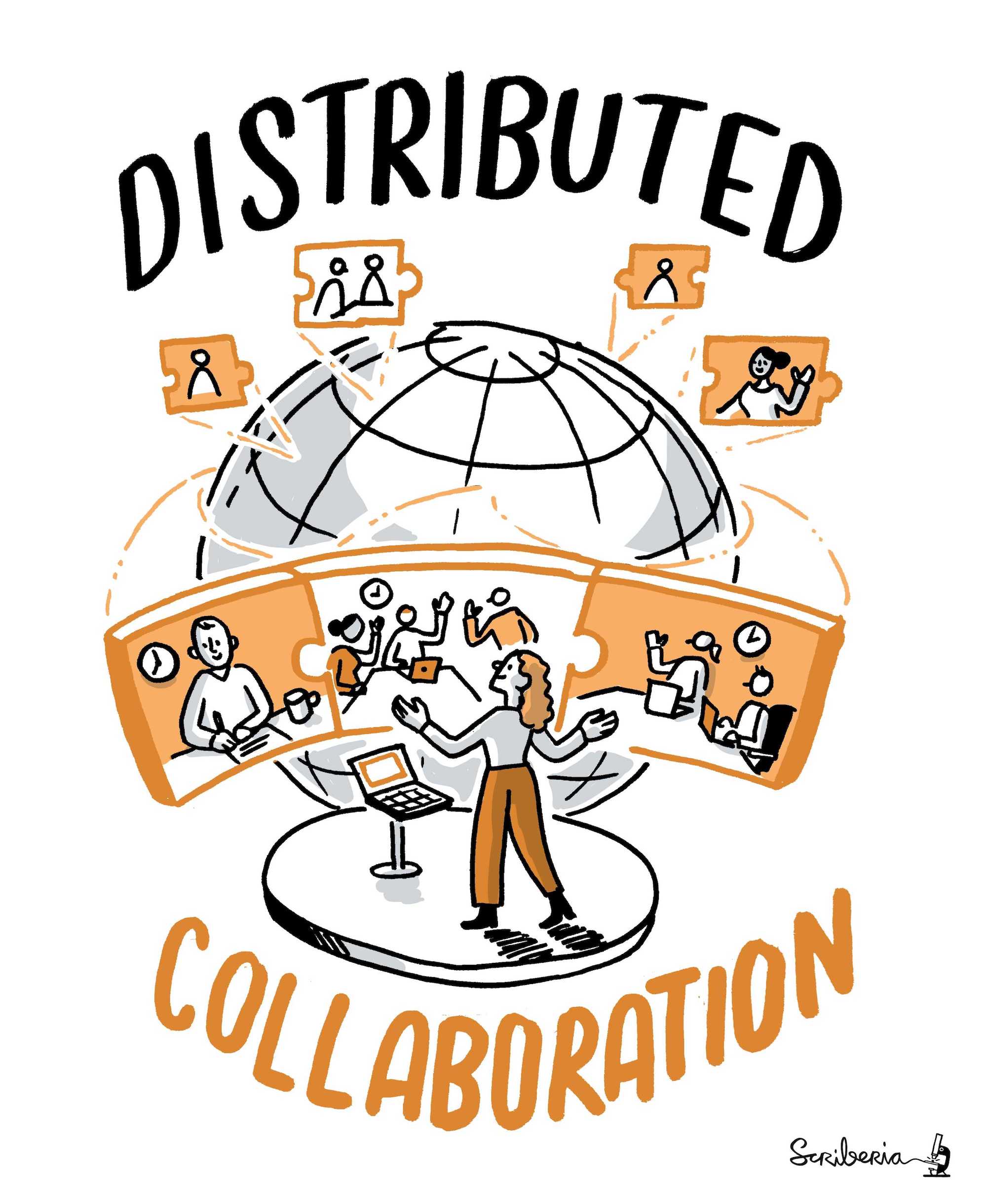Fig. 19 Illustration of Distributed Collaboration, The Turing Way Community, & Scriberia. (2020, March 3). Illustrations from the Turing Way book dashes. Zenodo. http://doi.org/10.5281/zenodo.3695300.¶